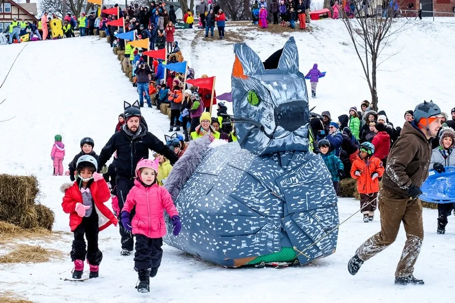 The Art Sled Rally is put on by neighborhood artists and residents in coordination with Adventures in Cardboard, the incredible staff at Powderthorn Park, local community organizations and business sponsors who all want to enrich the spirit of community life in Powderhorn through free public events with a focus on artistic expression and out-of-the-ordinary spectacle.